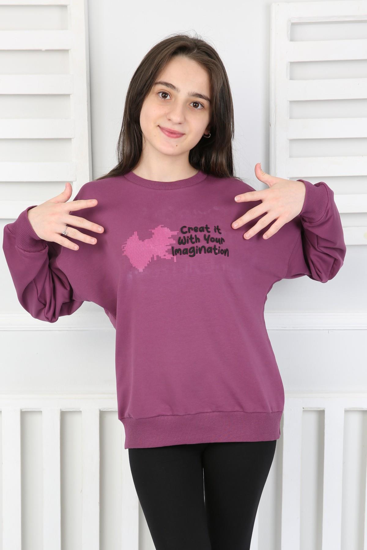 %100 Cotton İki İplik Baskılı Kız Sweatshirt (6630MOR)